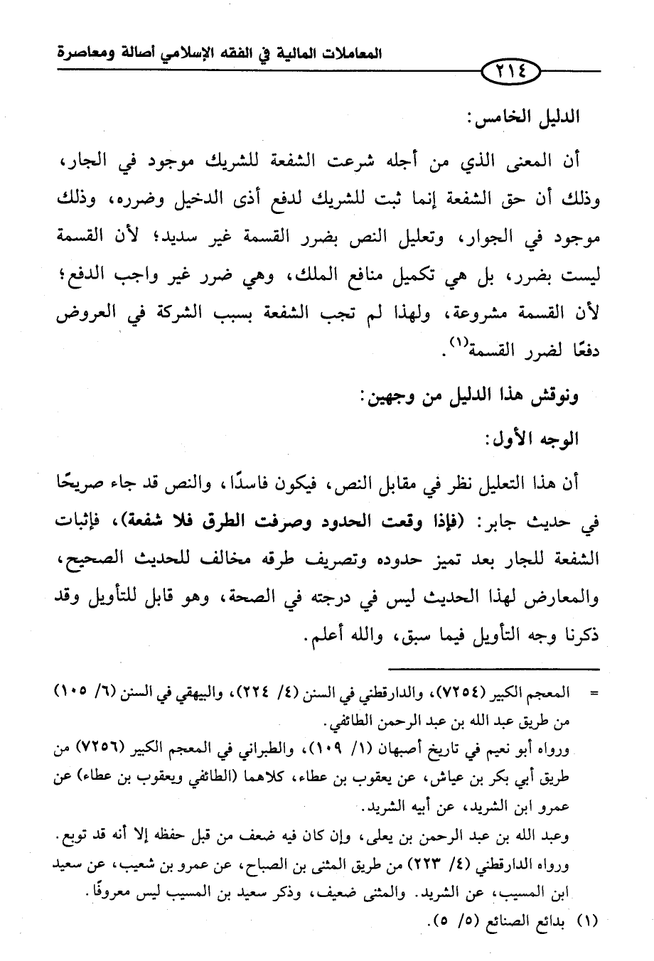 أن هذا التعليل نظر في مقابل النص، فيكون فاسدا، والنص قد جاء صريحا في حديث جابر: (فإذا وقعت الحدود وصرفت الطرق فلا شفعة)، فإثبات الشفعة للجار بعد يتميز حدوده وتصريف طرقه مخالف للحديث الصحيح، والمعارض لهذا الحديث ليس في درجته في الصحة، وهو قابل للتأويل وقد ذكرنا وجه التأويل فيما سبق، والله أعلم.
