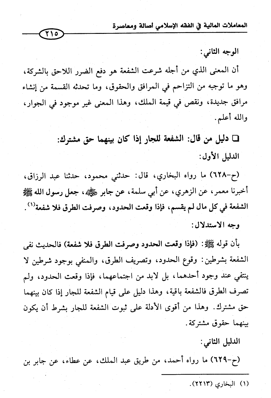 (ح-٦٢٨) ما رواه البخاري، قال: حدثني محمود، حدثنا عبد الرزاق، أخبرنا معمر، عن الزهري، عن أبي سلمة، عن جابر - رضي الله عنه -، جعل رسول الله - صلى الله عليه وسلم - الشفعة في كل مال لم يقسم، فإذا وقعت الحدود، وصرفت الطرق فلا شفعة (¬١).