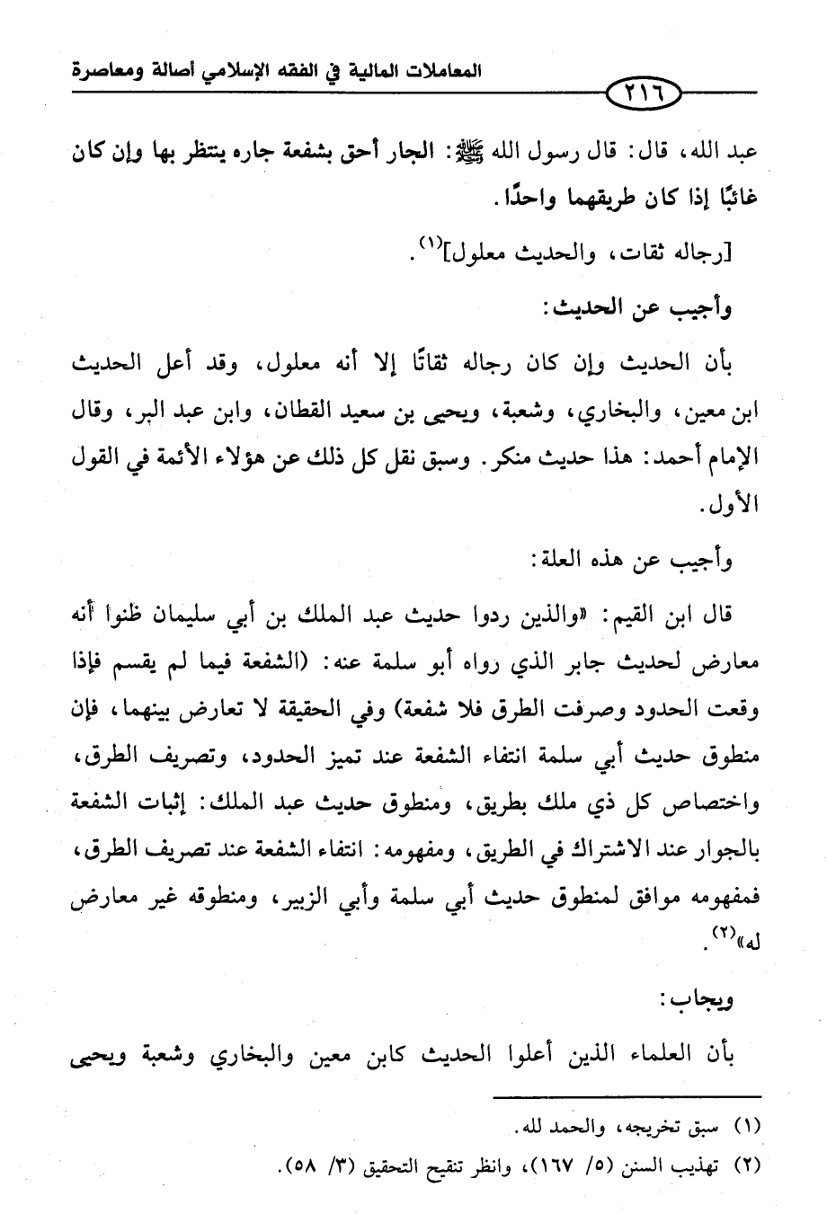 قال ابن القيم: "والذين ردوا حديث عبد الملك بن أبي سليمان ظنوا أنه معارض لحديث جابر الذي رواه أبو سلمة عنه: (الشفعة فيما لم يقسم فإذا وقعت الحدود وصرفت الطرق فلا شفعة) وفي الحقيقة لا تعارض بينهما، فإن منطوق حديث أبي سلمة انتفاء الشفعة عند يتميز الحدود، وتصريف الطرق، واختصاص كل ذي ملك بطريق، ومنطوق حديث عبد الملك: إثبات الشفعة بالجوار عند الاشتراك في الطريق، ومفهومه: انتفاء الشفعة عند تصريف الطرق، فمفهومه موافق لمنطوق حديث أبي سلمة وأبي الزبير، ومنطوقه غير معارض له" (¬٢).