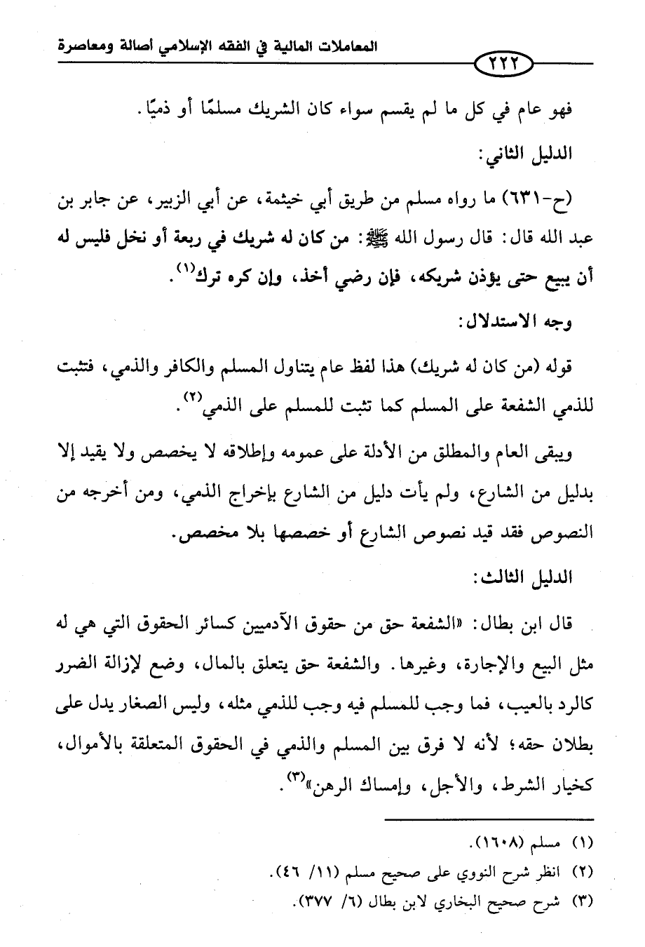 قال ابن بطال: "الشفعة حق من حقوق الآدميين كسائر الحقوق التي هي له مثل البيع والإجارة، وغيرها. والشفعة حق يتعلق بالمال، وضع لإزالة الضرر كالرد بالعيب، فما وجب للمسلم فيه وجب للذمي مثله، وليس الصغار يدل على بطلان حقه؛ لأنه لا فرق بين المسلم والذمي في الحقوق المتعلقة بالأموال، كخيار الشرط، والأجل، وإمساك الرهن" (¬٣).