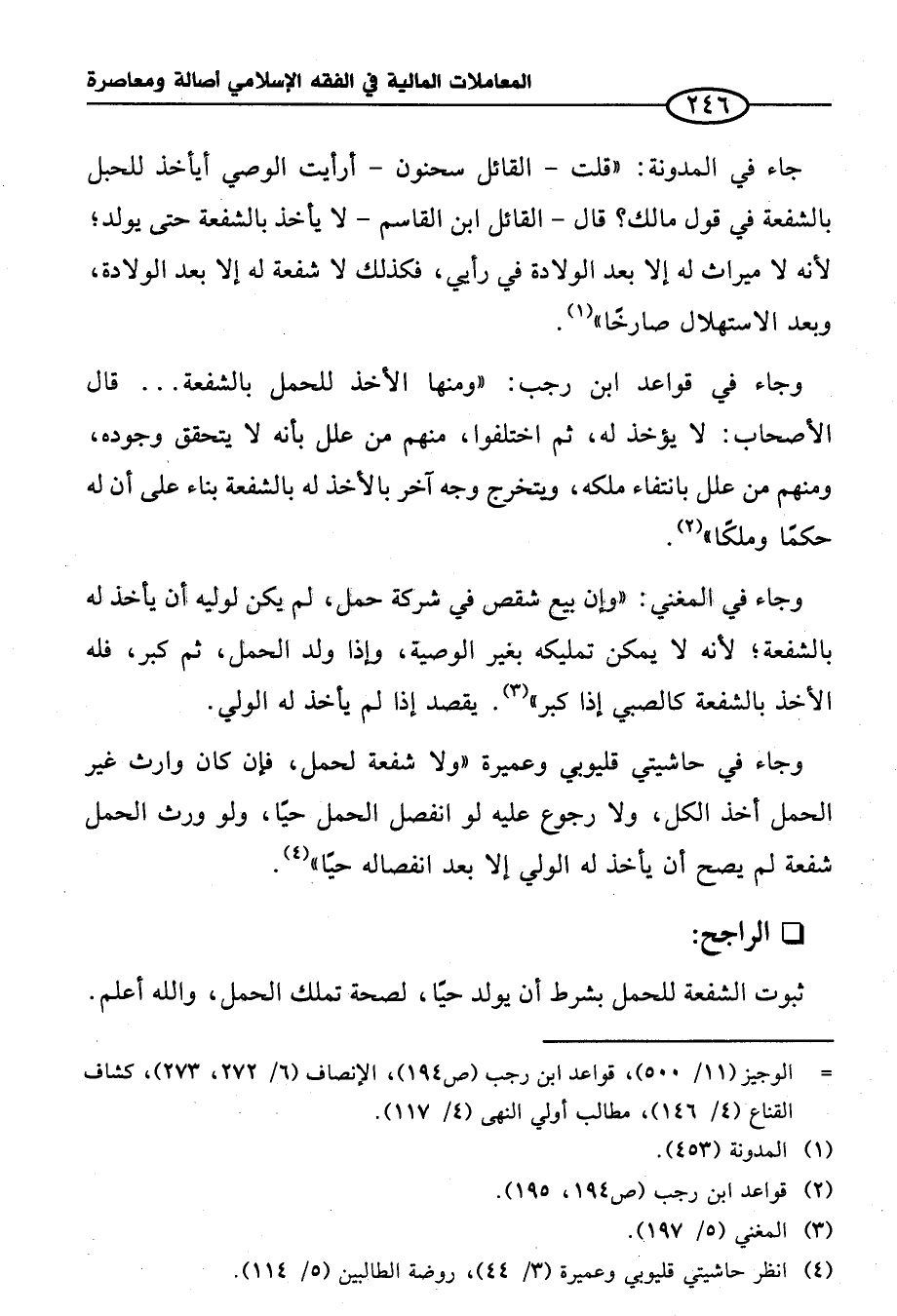 وجاء في قواعد ابن رجب: "ومنها الأخذ للحمل بالشفعة ... قال الأصحاب: لا يؤخذ له، ثم اختلفوا، منهم من علل بأنه لا يتحقق وجوده، ومنهم من علل بانتفاء ملكه، ويتخرج وجه آخر بالأخذ له بالشفعة بناء على أن له حكمًا وملكًا" (¬٢).