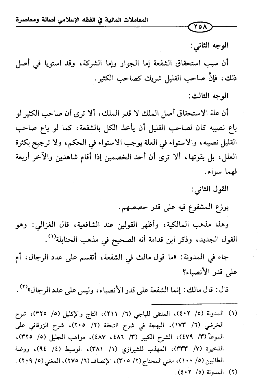 جاء في المدونة: "ما قول مالك في الشفعة، أتقسم على عدد الرجال، أم على قدر الأنصباء؟