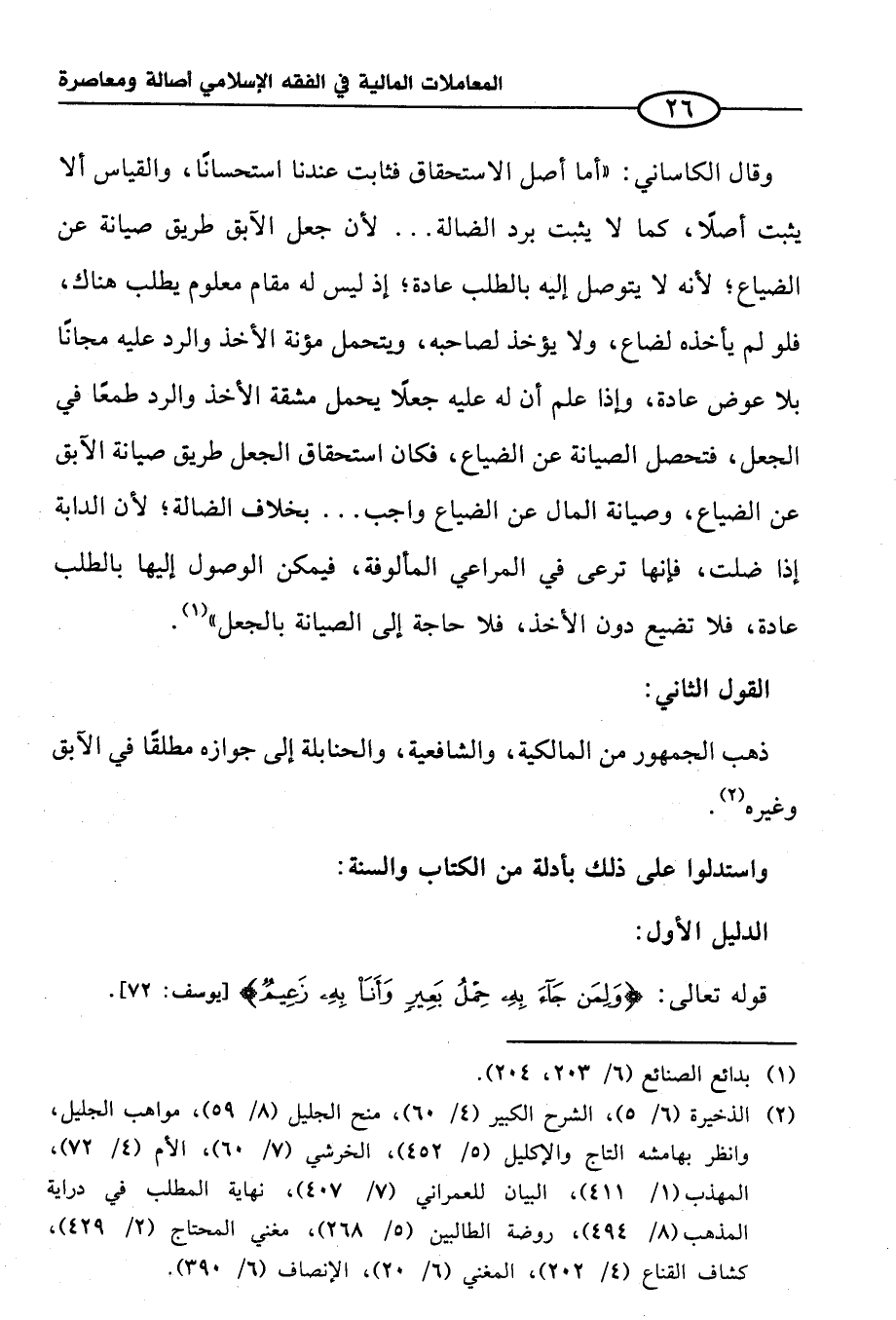 وقال الكاساني: "أما أصل الاستحقاق فثابت عندنا استحسانًا، والقياس ألا يثبت أصلًا، كما لا يثبت برد الضالة ... لأن جعل الآبق طريق صيانة عن الضياع؛ لأنه لا يتوصل إليه بالطلب عادة. إذ ليس له مقام معلوم يطلب هناك، فلو لم يأخذه لضاع، ولا يؤخذ لصاحبه، ويتحمل مؤنة الأخذ والرد عليه مجانًا بلا عوض عادة، وإذا علم أن له عليه جعلًا يحمل مشقة الأخذ والرد طمعًا في الجعل، فتحصل الصيانة عن الضياع، فكان استحقاق الجعل طريق صيانة الآبق عن الضياع، وصيانة المال عن الضياع واجب ... بخلاف الضالة؛ لأن الدابة إذا ضلت، فمنها ترعى في المراعي المألوفة، فيمكن الوصول إليها بالطلب عادة، فلا تضيع دون الأخذ، فلا حاجة إلى الصيانة بالجعل" (¬١).