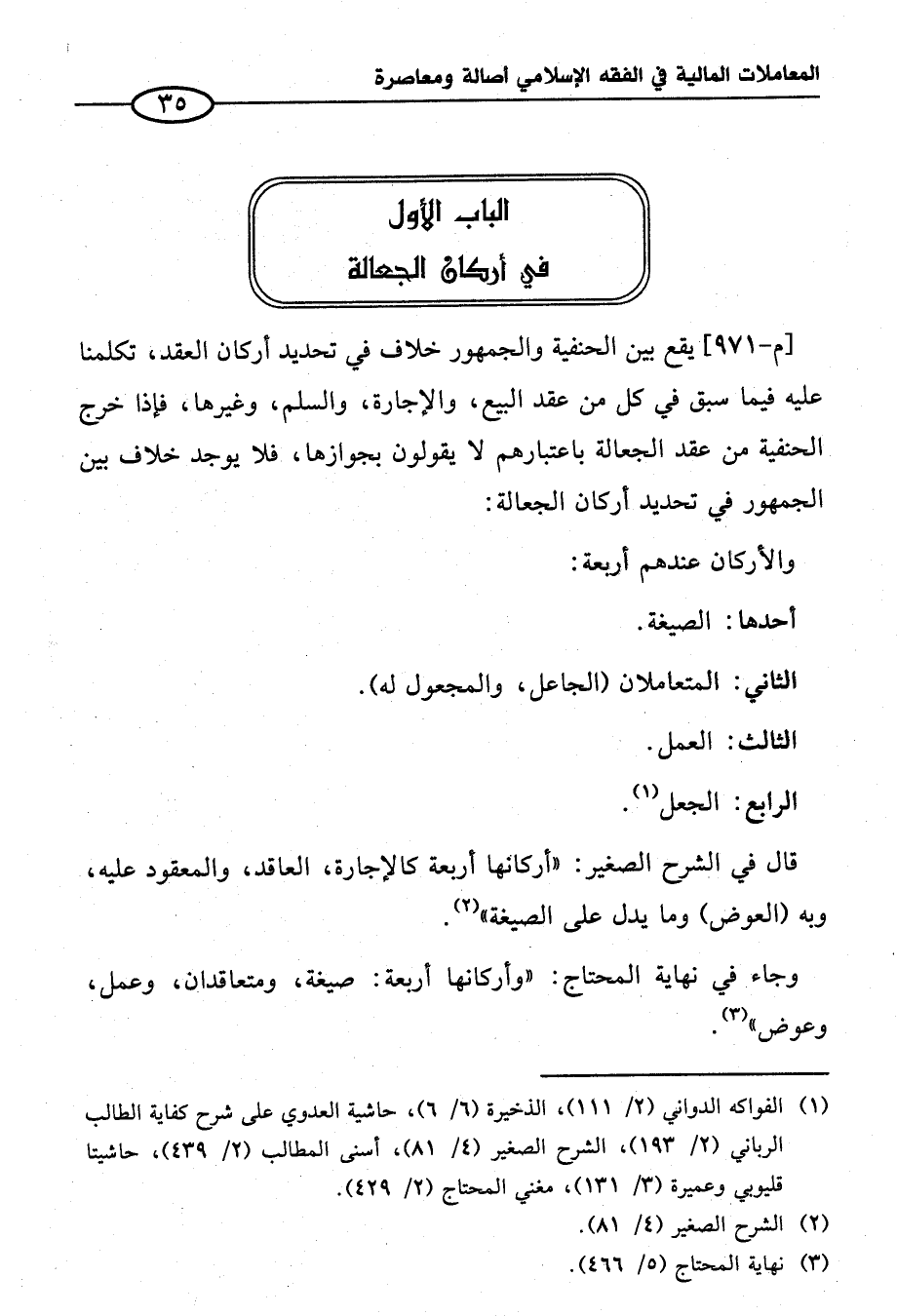 [م - ٩٧١]، يقع بين الحنفية والجمهور خلاف في تحديد أركان العقد، تكلمنا عليه فيما سبق في كل من عقد البيع، والإجارة، والسلم، وغيرها، فإذا خرج الحنفية من عقد الجعالة باعتبارهم لا يقولون بجوازها، فلا يوجد خلاف بين الجمهور في تحديد أركان الجعالة:
