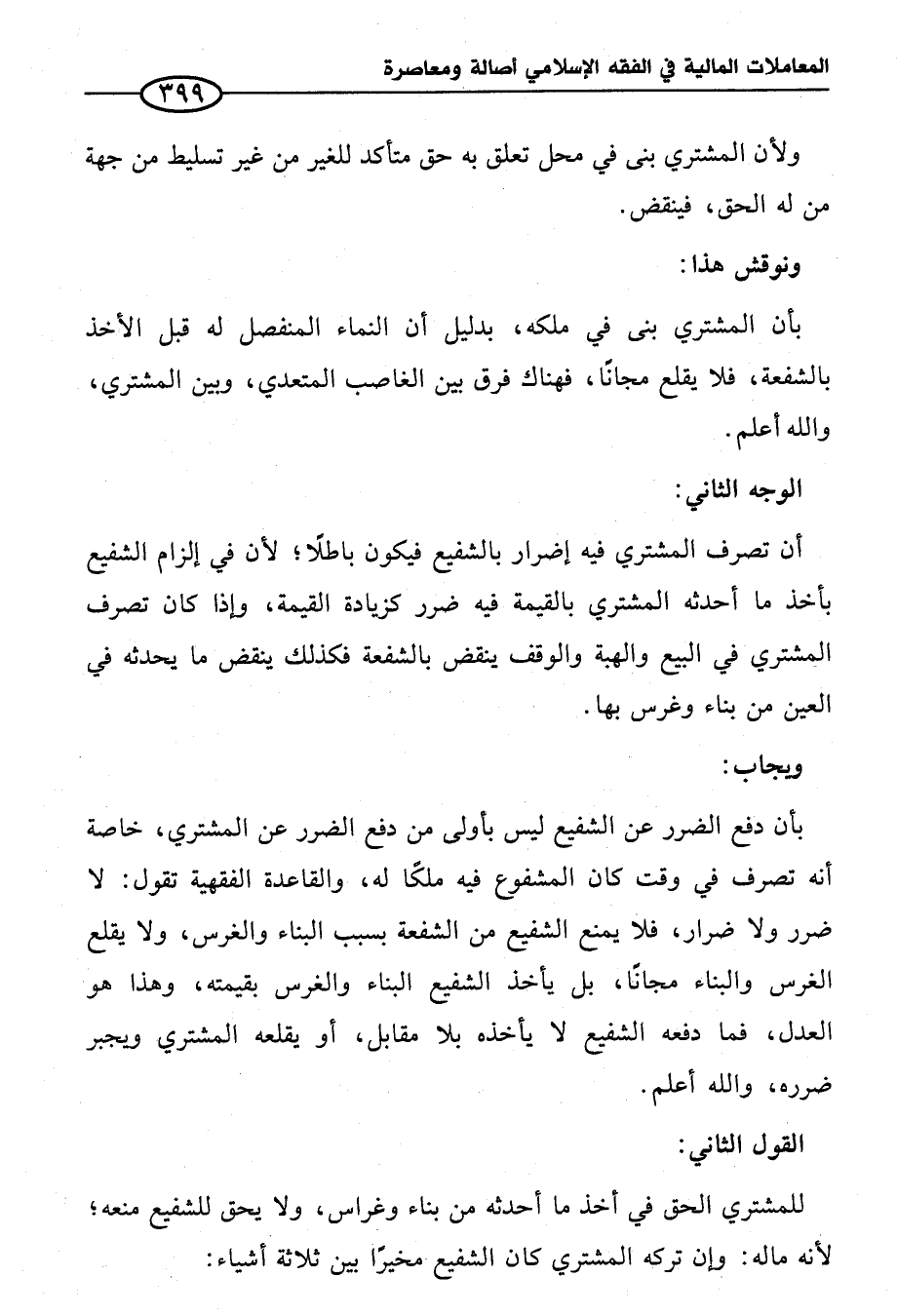 بأن دفع الضرر عن الشفيع ليس بأولى من دفع الضرر عن المشتري، خاصة أنه تصرف في وقت كان المشفوع فيه ملكًا له، والقاعدة الفقهية تقول: لا ضرر ولا ضرار، فلا يمنع الشفيع من الشفعة بسبب البناء والغرس، ولا يقلع الغرس والبناء مجانًا، بل يأخذ الشفيع البناء والغرس بقيمته، وهذا هو العدل، فما دفعه الشفيع لا يأخذه بلا مقابل، أو يقلعه المشتري ويجبر ضرره، والله أعلم.