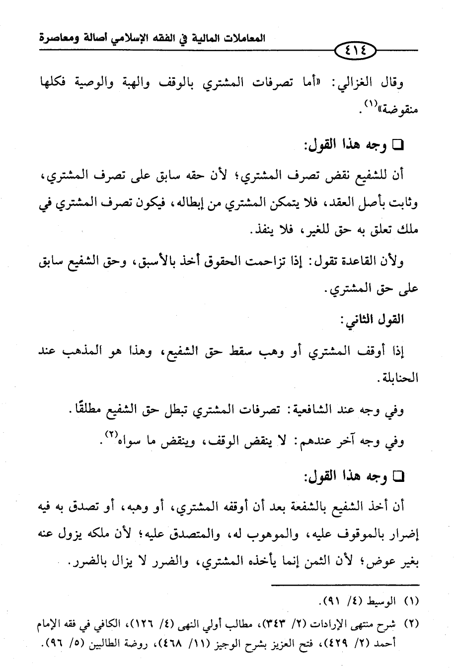(¬٢) شرح منتهى الإرادات (٢/ ٣٤٣)، مطالب أولي النهى (٤/ ١٢٦)، الكافي في فقه الإِمام أحمد (٢/ ٤٢٩)، فتح العزيز بشرح الوجيز (١١/ ٤٦٨)، روضة الطالبين (٥/ ٩٦).