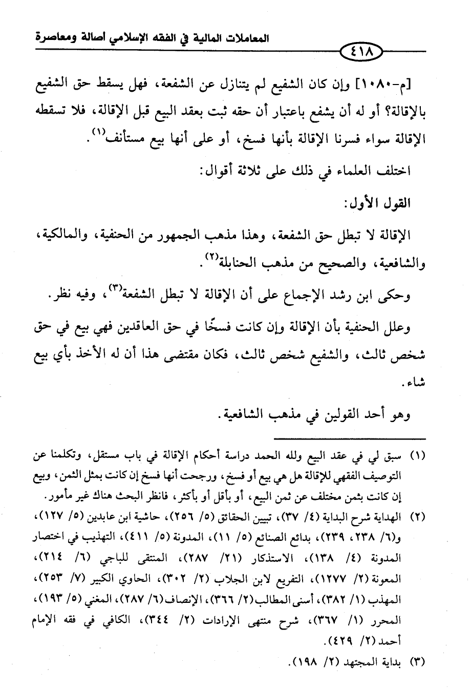 (¬١) سبق لي في عقد البيع ولله الحمد دراسة أحكام الإقالة في باب مستقل، وتكلمنا عن التوصيف الفقهي للإقالة هل هي بيع أو فسخ، ورجحت أنها فسخ إن كانت بمثل الثمن، وبيع إن كانت بثمن مختلف عن ثمن البيع، أو بأقل أو بأكثر، فانظر البحث هناك غير مأمور.
