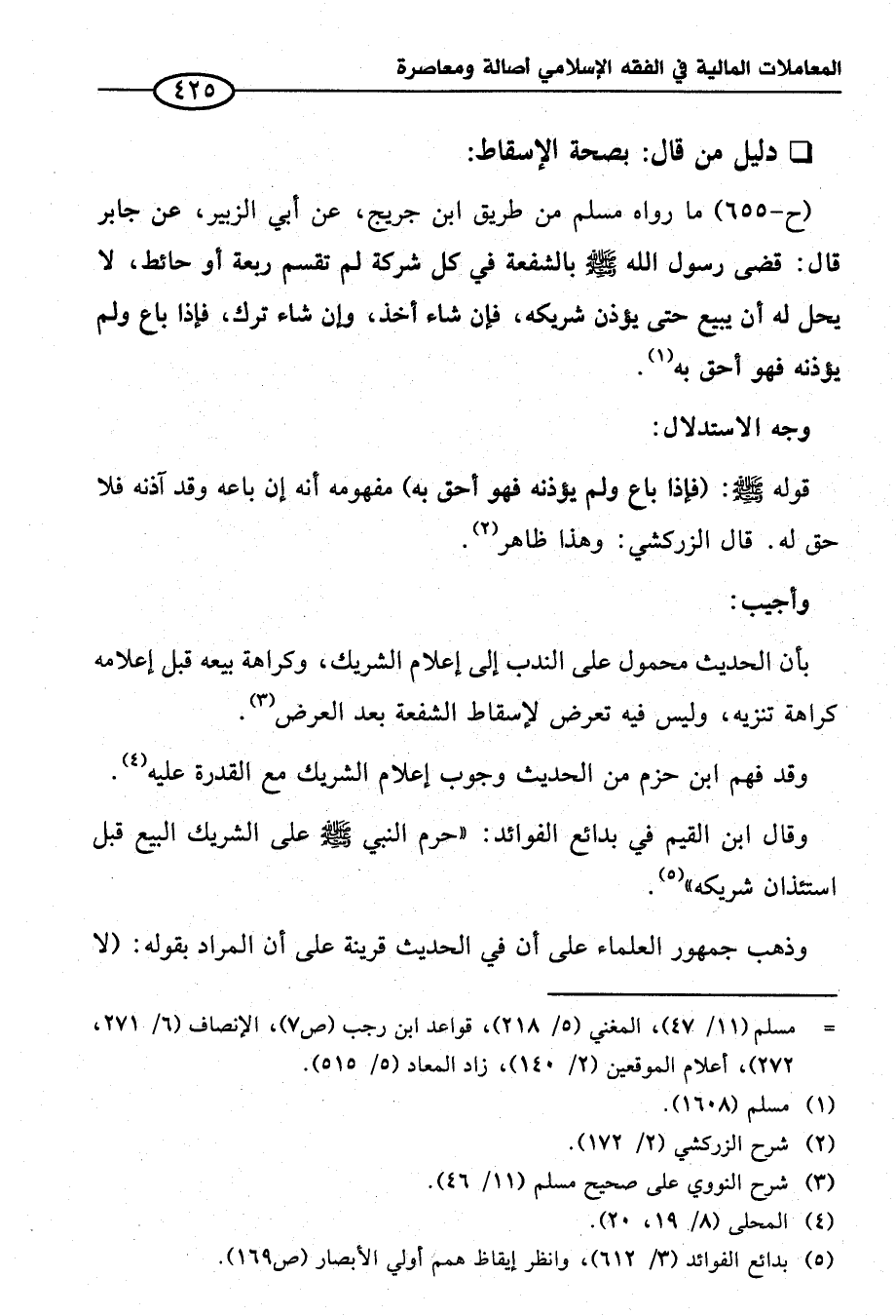 وقال ابن القيم في بدائع الفوائد: "حرم النبي - صلى الله عليه وسلم - على الشريك البيع قبل استئذان شريكه" (¬٥).