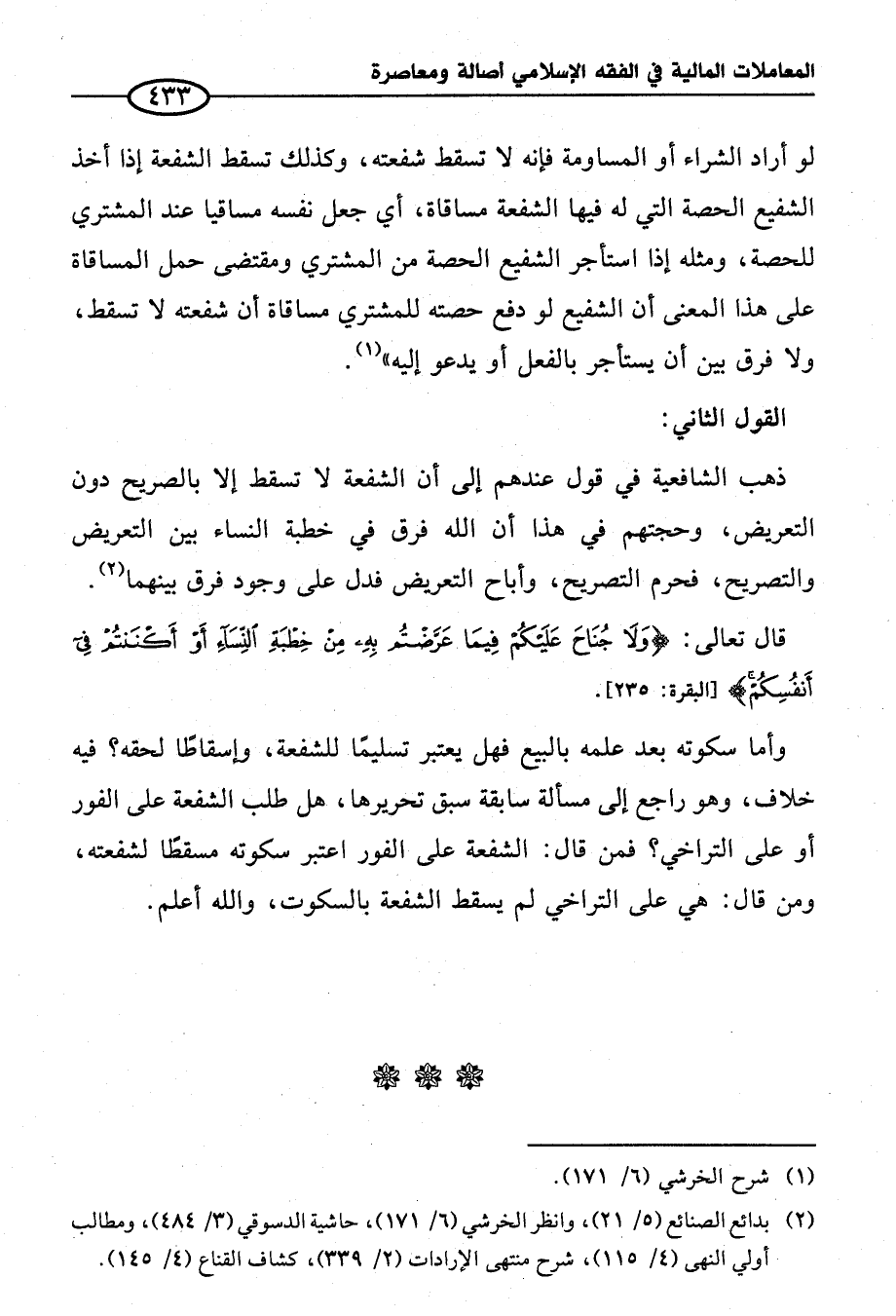 ذهب الشافعية في قول عندهم إلى أن الشفعة لا تسقط إلا بالصريح دون التعريض، وحجتهم في هذا أن الله فرق في خطبة النساء بين التعريض والتصريح، فحرم التصريح، وأباح التعريض فدل على وجود فرق بينهما (¬٢).