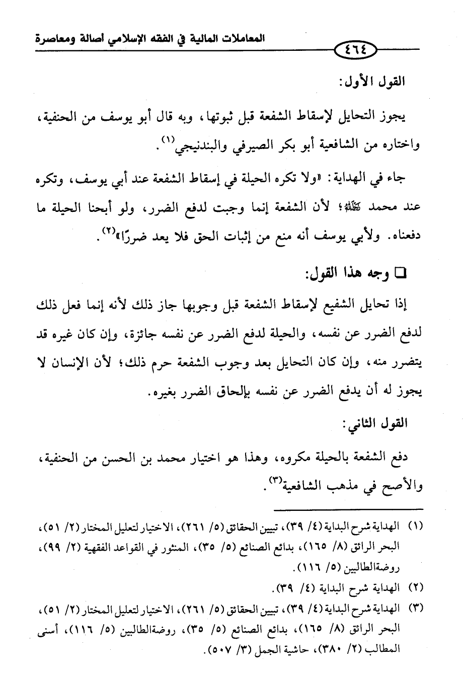 جاء في الهداية: "ولا تكره الحيلة في إسقاط الشفعة عند أبي يوسف، وتكره عند محمَّد - رحمه الله -؛ لأن الشفعة إنما وجبت لدفع الضرر، ولو أبحنا الحيلة ما دفعناه. ولأبي يوسف أنه منع من إثبات الحق فلا يعد ضررًا" (¬٢).