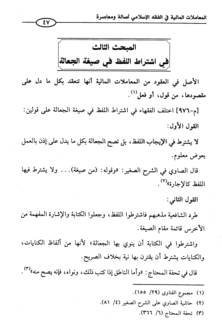 المبحث الثالث في اشتراط اللفظ في صيغة الجعالة