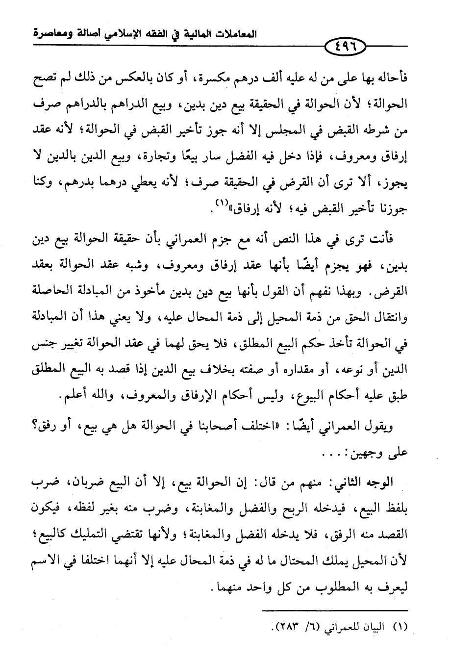فأنت ترى في هذا النص أنه مع جزم العمراني بأن حقيقة الحوالة بيع دين بدين، فهو يجزم أيضًا بأنها عقد إرفاق ومعروف، وشبه عقد الحوالة بعقد القرض. وبهذا نفهم أن القول بأنها بيع دين بدين مأخوذ من المبادلة الحاصلة وانتقال الحق من ذمة المحيل إلى ذمة المحال عليه، ولا يعني هذا أن المبادلة في الحوالة تأخذ حكم البيع المطلق، فلا يحق لهما في عقد الحوالة تغيير جنس الدين أو نوعه، أو مقداره أو صفته بخلاف بيع الدين إذا قصد به البيع المطلق طبق عليه أحكام البيوع، وليس أحكام الإرفاق والمعروف، والله أعلم.