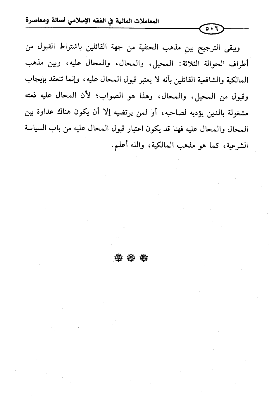 ويبقى الترجيح بين مذهب الحنفية من جهة القائلين باشتراط القبول من أطراف الحوالة الثلاثة: المحيل، والمحال، والمحال عليه، وبين مذهب المالكية والشافعية القائلين بأنه لا يعتبر قبول المحال عليه، وإنما تنعقد بإيجاب وقبول من المحيل، والمحال، وهذا هو الصواب؛ لأن المحال عليه ذمته مشغولة بالدين يؤديه لصاحبه، أو لمن يرتضيه إلا أن يكون هناك عداوة بين المحال والمحال عليه فهنا قد يكون اعتبار قبول المحال عليه من باب السياسة الشرعية، كما هو مذهب المالكية، والله أعلم.