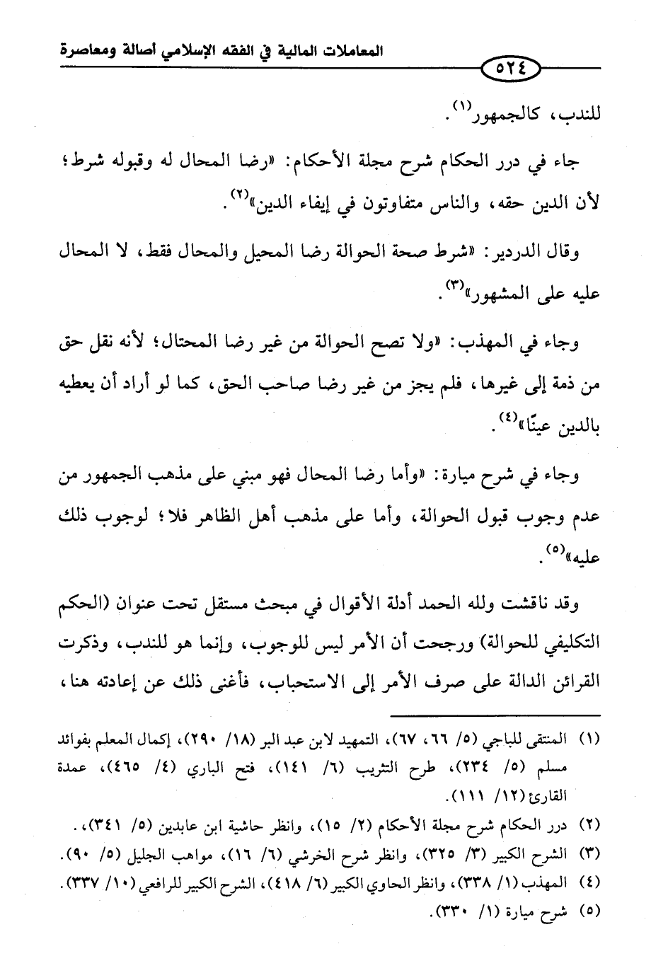 وجاء في شرح ميارة: "وأما رضا المحال فهو مبني على مذهب الجمهور من عدم وجوب قبول الحوالة، وأما على مذهب أهل الظاهر فلا؛ لوجوب ذلك عليه" (¬٥).