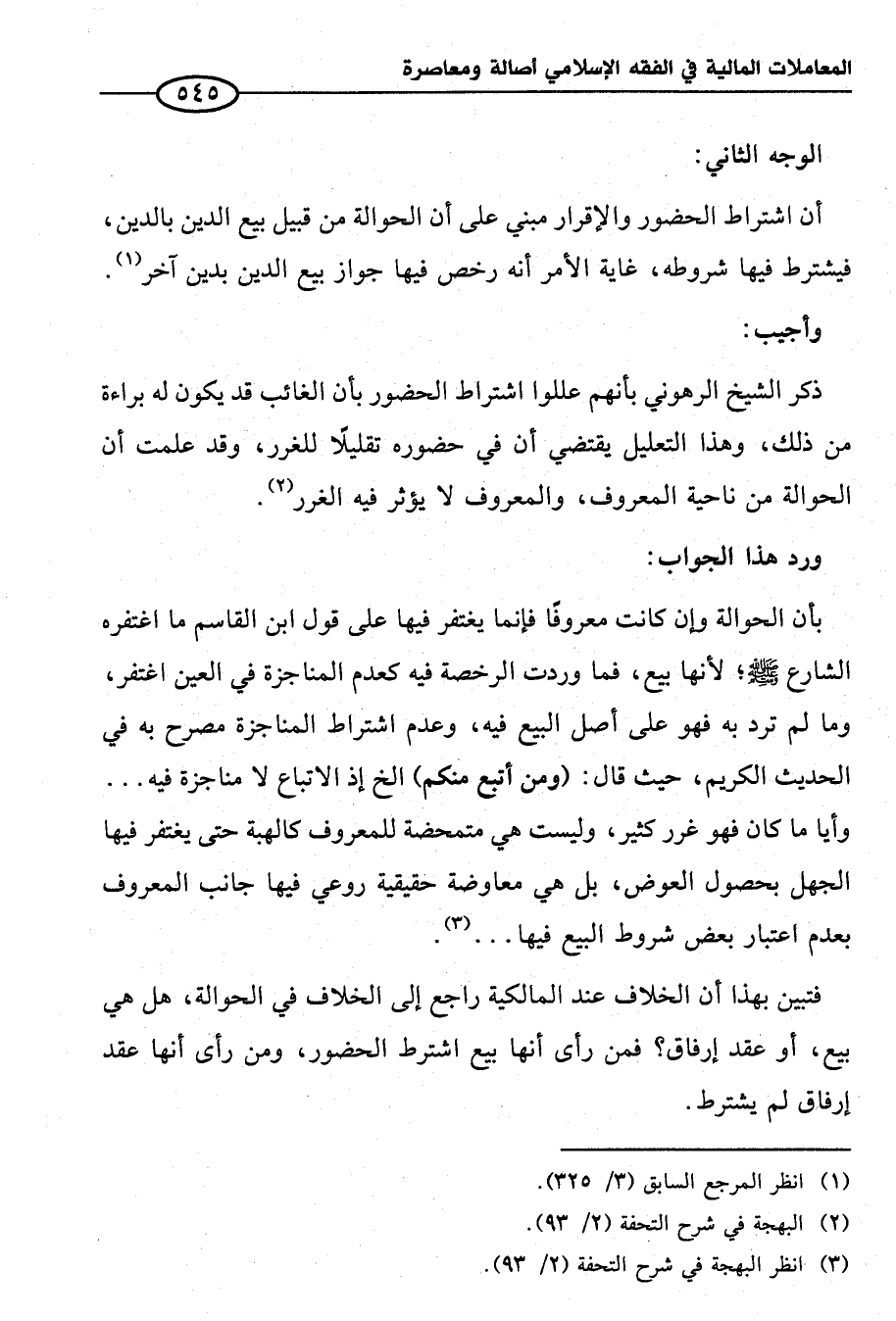 بأن الحوالة وإن كانت معروفًا فإنما يغتفر فيها على قول ابن القاسم ما اغتفره الشارع - صلى الله عليه وسلم -؛ لأنها بيع، فما وردت الرخصة فيه كعدم المناجزة في العين اغتفر، وما لم ترد به فهو على أصل البيع فيه، وعدم اشتراط المناجزة مصرح به في الحديث الكريم، حيث قال: (ومن أتبع منكم) الخ إذ الاتباع لا مناجزة فيه ... وأيا ما كان فهو غرر كثير، وليست هي متمحضة للمعروف كالهبة حتى يغتفر فيها الجهل بحصول العوض، بل هي معاوضة حقيقية روعي فيها جانب المعروف بعدم اعتبار بعض شروط البيع فيها ... (¬٣).