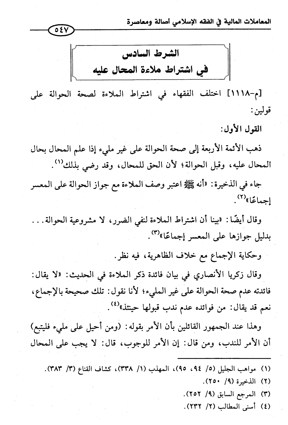 الشرط السادس في اشتراط ملاءة المحال عليه
