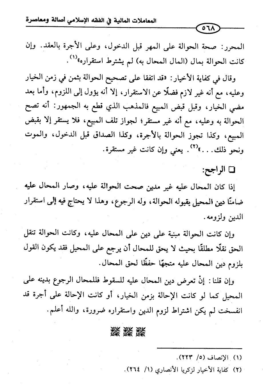 المحرر: صحة الحوالة على المهر قبل الدخول، وعلى الأجرة بالعقد، وإن كانت الحوالة بمال (المال المحال به) لم يشترط استقراره" (¬١).
