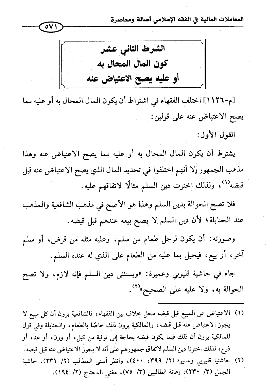 (¬٢) حاشتيا قليوبي وعميرة (٢/ ٣٩٩، ٤٠٠)، وانظر أسنى المطالب (٢/ ٢٣١)، حاشية الجمل (٣/ ٢٣٠)، إعانة الطالبين (٣/ ٧٥)، مغني المحتاج (٢/ ١٩٤).
