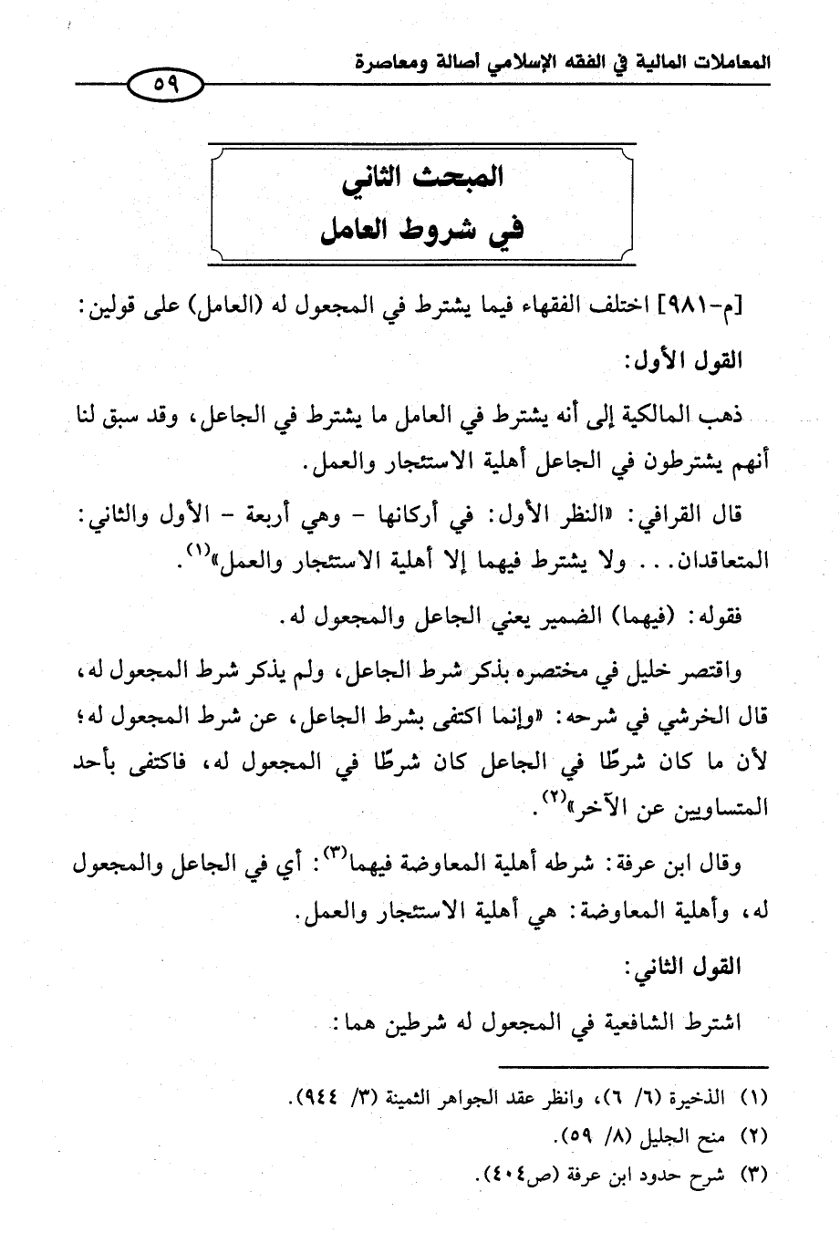 واقتصر خليل في مختصره بذكر شرط الجاعل، ولم يذكر شرط المجعول له، قال الخرشي في شرحه: "وإنما اكتفى بشرط الجاعل، عن شرط المجعول له؛ لأن ما كان شرطًا في الجاعل كان شرطًا في المجعول له، فاكتفى بأحد المتساويين عن الآخر" (¬٢).