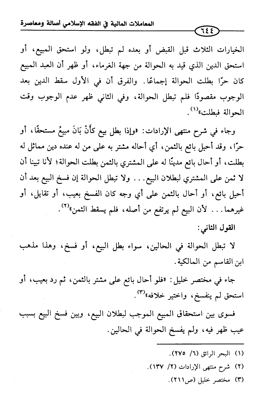 جاء في مختصر خليل: "فلو أحال بائع على مشتر بالثمن، ثم رد بعيب، أو استحق لم ينفسخ، واختير خلافه" (¬٣).