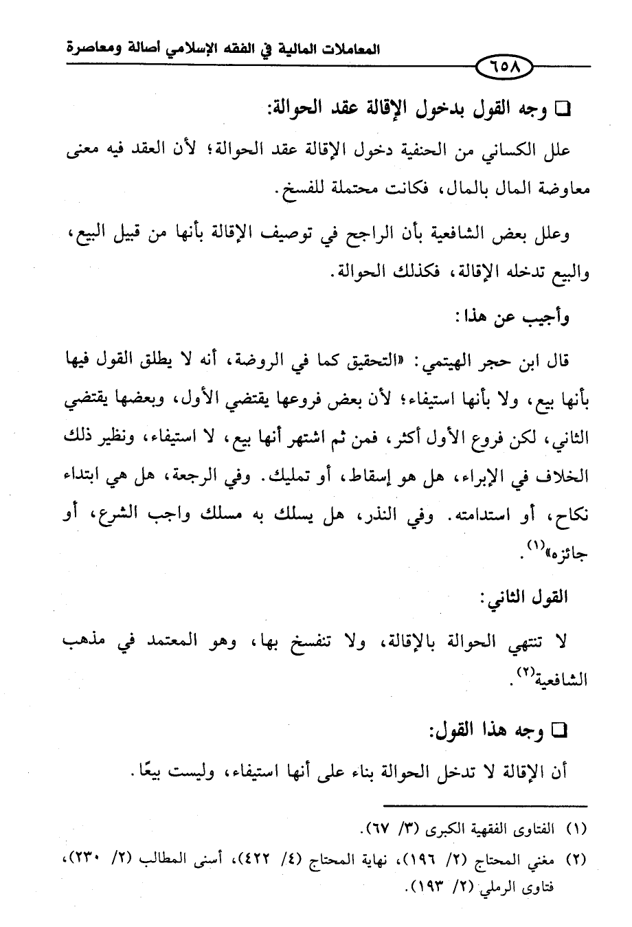 وعلل بعض الشافعية بأن الراجح في توصيف الإقالة بأنها من قبيل البيع، والبيع تدخله الإقالة، فكذلك الحوالة.
