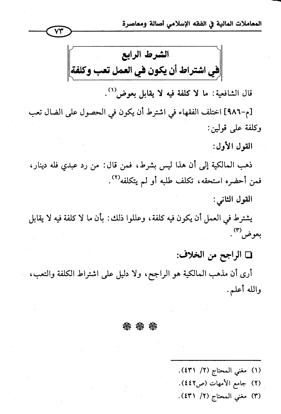 يشترط في العمل أن يكون فيه كلفة، وعللوا ذلك: بأن ما لا كلفة فيه لا يقابل بعوض (¬٣).