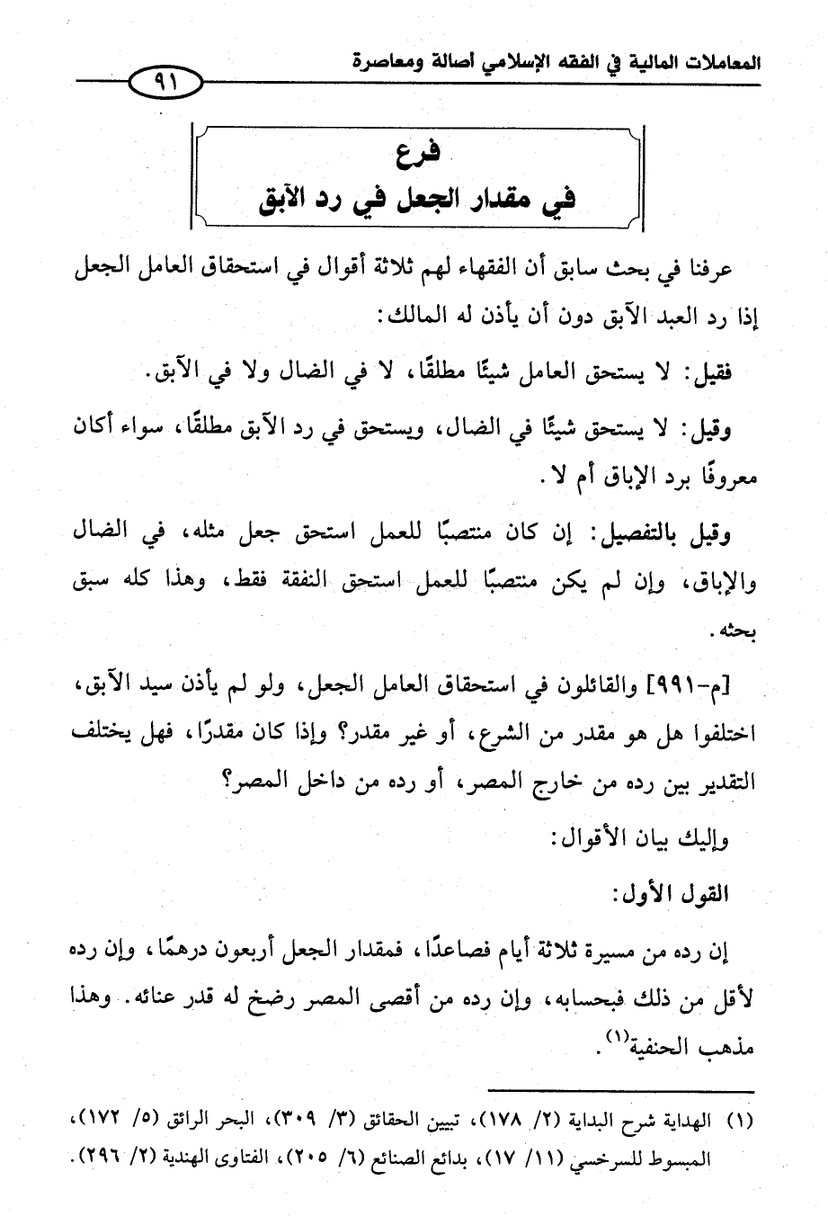 [م - ٩٩١] والقائلون في استحقاق العامل الجعل، ولو لم يأذن سيد الآبق، اختلفوا هل هو مقدر من الشرع، أو غير مقدر؟ وإذا كان مقدرًا، فهل يختلف التقدير بين رده من خارج المصر، أو رده من داخل المصر؟