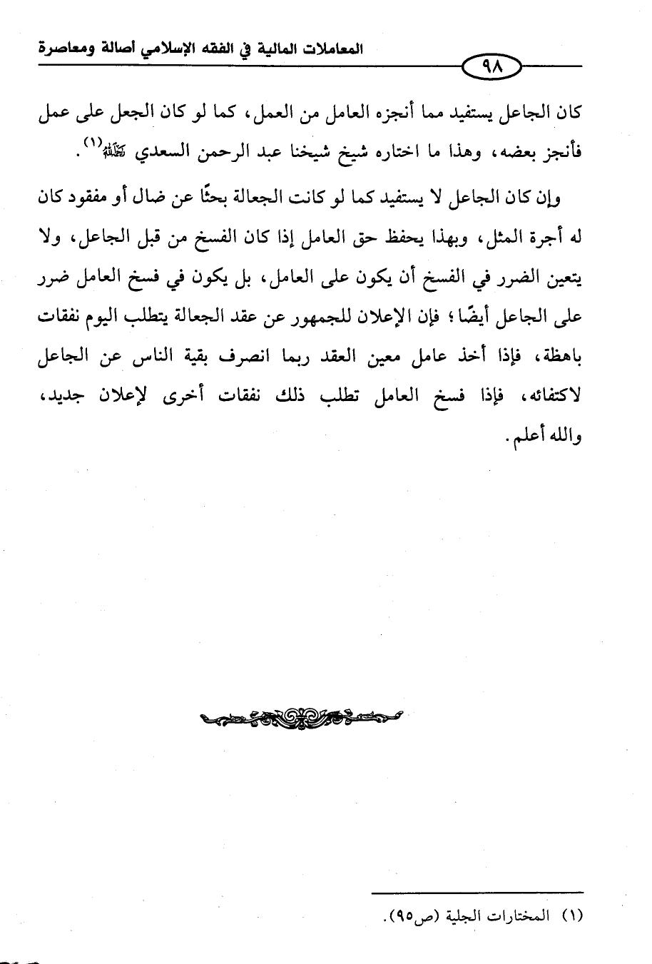 وإن كان الجاعل لا يستفيد كما لو كانت الجعالة بحثًا عن ضال أو مفقود كان له أجرة المثل، وبهذا يحفظ حق العامل إذا كان الفسخ من قبل الجاعل، ولا يتعين الضرر في الفسخ أن يكون على العامل، بل يكون في فسخ العامل ضرر على الجاعل أيضًا؛ فإن الإعلان للجمهور عن عقد الجعالة يتطلب اليوم نفقات باهظة، فإذا أخذ عامل معين العقد ربما انصرف بقية الناس عن الجاعل لاكتفائه، فإذا فسخ العامل تطلب ذلك نفقات أخرى لإعلان جديد، والله أعلم.