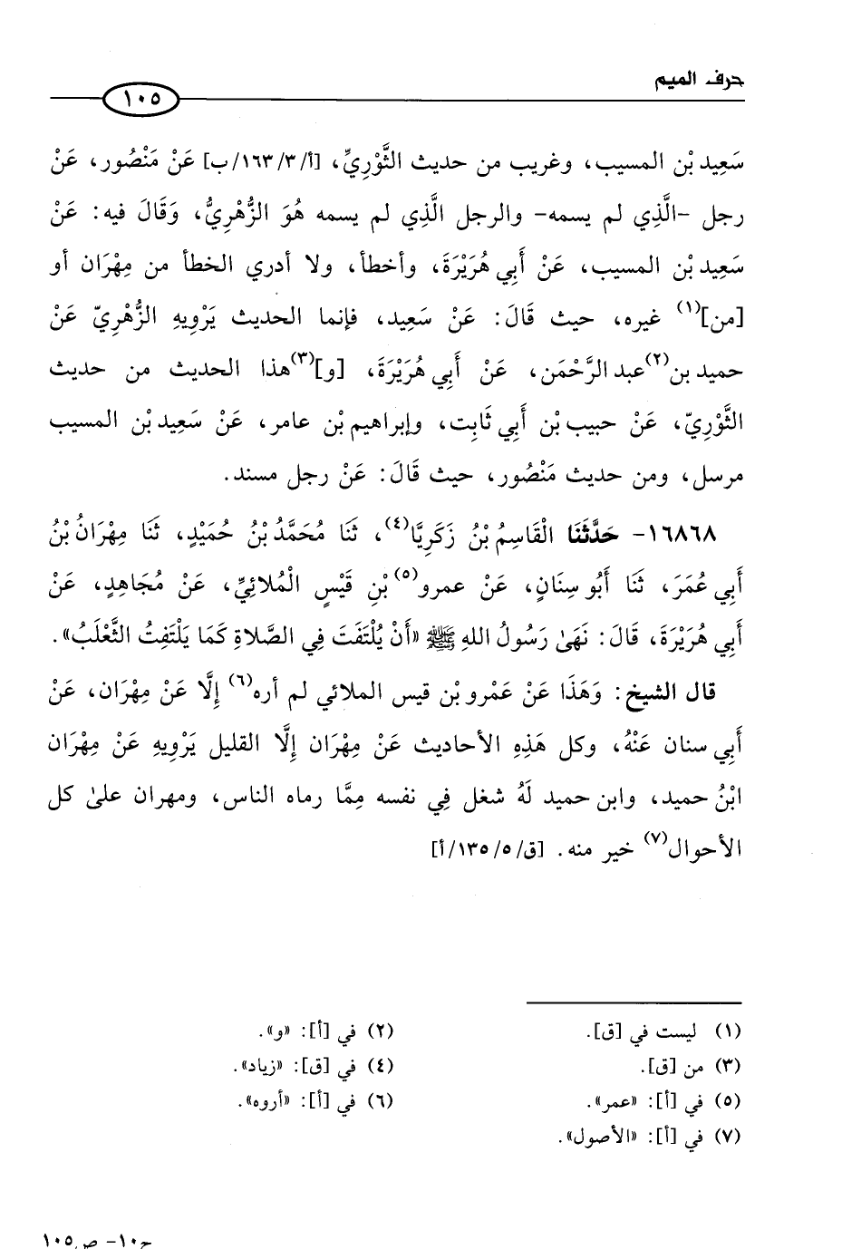 16868 - حَدثنا القاسم بن زكريا، حَدثنا مُحمد بن حميد، حَدثنا مهران بن أبي عُمر، حَدثنا أَبو سنان، عن عَمرو بن قيس الملائي، عن مجاهد، عن أبي هريرة، قال: نهى رسول الله صَلى الله عَليه وسَلم أن يلتفت في الصلاة كما يلتفت الثعلب.