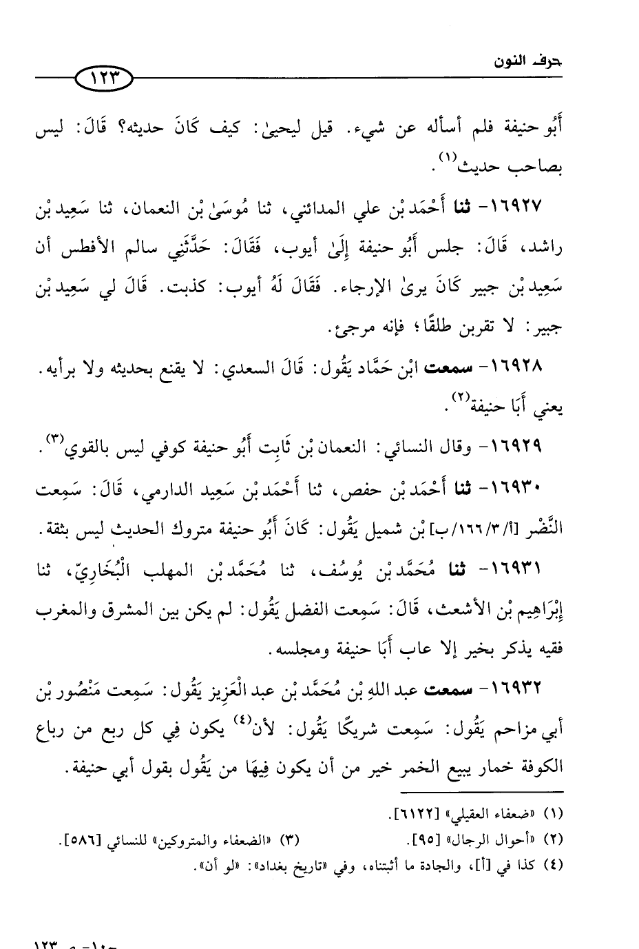16928 - سمعتُ ابن حماد، يقول: قال السعدي: لا يقنع بحديثه، ولا برأيه، يعني أبا حنيفة.