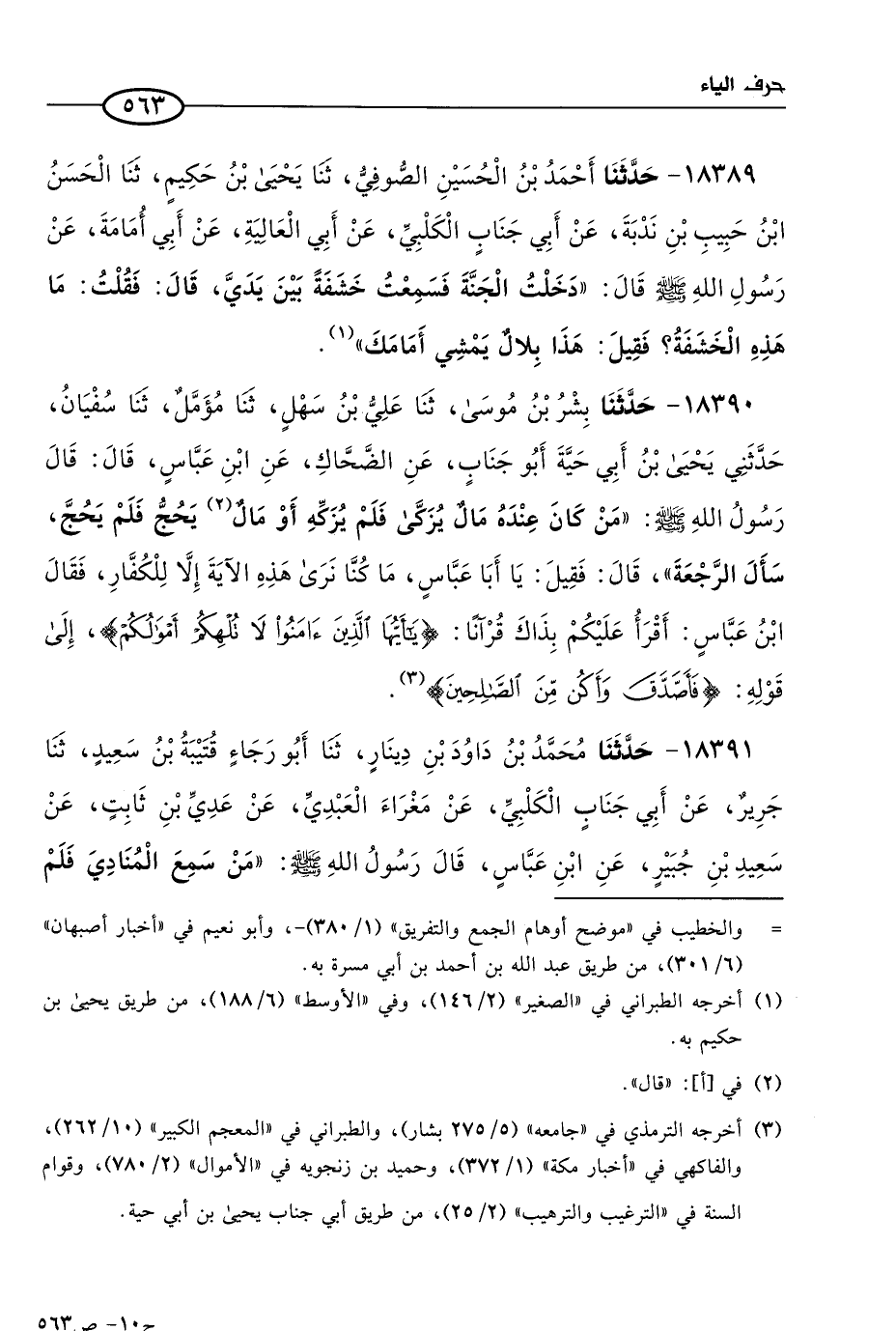 18390 - حَدثنا بشر بن موسى، حَدثنا علي بن سهل، حَدثنا مؤمل، حَدثنا سفيان، حَدَّثني يحيى بن أبي حية أَبو جناب، عن الضحاك، عن ابن عباس، قال: قال رسول الله صَلى الله عَليه وسَلم: من كان عنده مال يزكى فلم يزكه، أو مال يحج فلم يحج، سأل الرجعة، قال: فقيل: يا أبا عباس، ما كنا نرى هذه الآية إلا للكفار، فقال ابن عباس: أقرأ عليكم بذاك قرآنا: {يا أيها الذين آمنوا لا تلهكم أموالكم} إلى قوله: {فأصدق وأكن من الصالحين}.