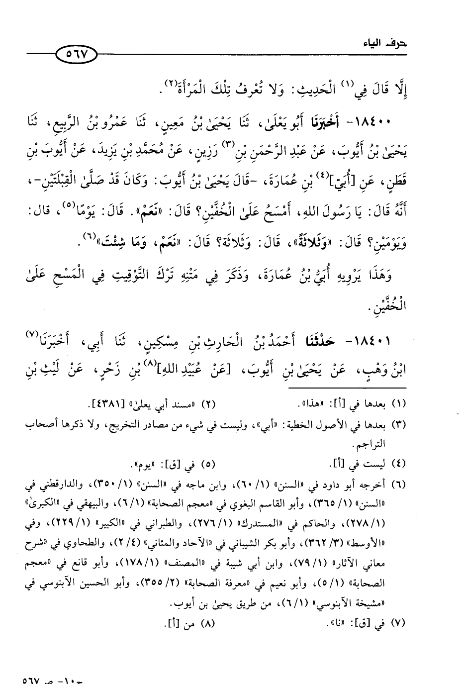 18400 - أخبرنا أَبو يعلَى، حَدثنا يحيى بن مَعين، حَدثنا عَمرو بن الربيع، حَدثنا يحيى بن أيوب، عن عَبد الرحمن بن رزين، عن مُحمد بن يزيد، عن أيوب بن قطن، عن أُبَىّ بن عمارة،- قال: يحيى بن أيوب وكان قد صلى القبلتين -، أنه قال: يا رسول الله، أمسح على الخفين؟ قال: نَعم، قال: يومًا، قال: ويومين؟ قال: ثلاثة، قال: وثلاثة؟ قال: نَعم، وما شئت.