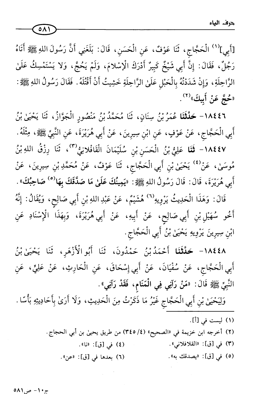 18446 - حَدثنا عُمر بن سنان، حَدثنا مُحمد بن منصور الجواز، حَدثنا يحيى بن أبي الحجاج، عن عوف، عن ابن سيرين، عن أبي هريرة، عن النبي صَلى الله عَليه وسلم؛ مثله.