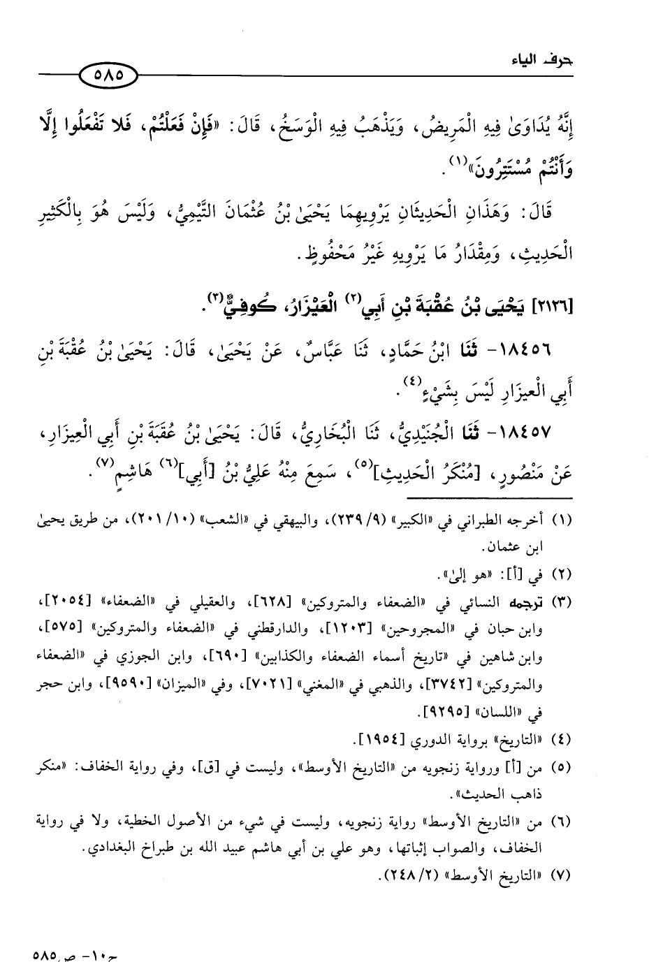 18457 - حَدثنا الجنيدي، حَدثنا البُخاري قال: يحيى بن عقبة بن أبي العيزار عن منصور منكر الحديث، سمع منه علي بن أبي هاشم.