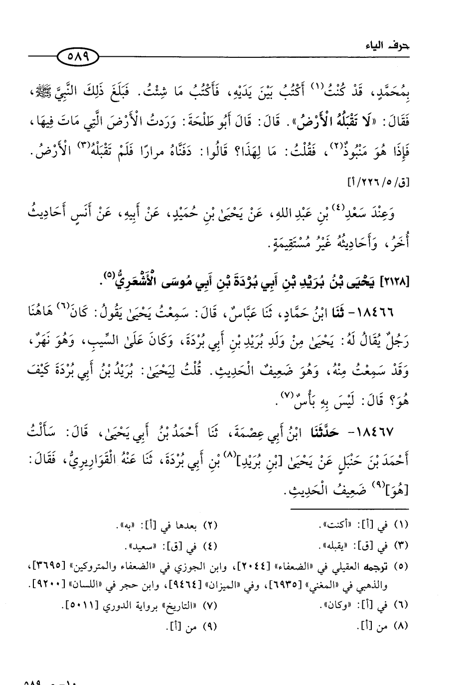 18466 - حَدثنا ابن حماد، حَدثنا عباس، قال: سمعتُ يحيى، يقول: كان هاهنا رجل، يقال له: يحيى من ولد بريد بن أبي بردة، وكان على السيب وهو نهر، وقد سمعت منه، وهو ضعيف الحديث، قلت ليحيى: بريد بن أبي بردة، كيف هو؟ قال: ليس به بأس.
