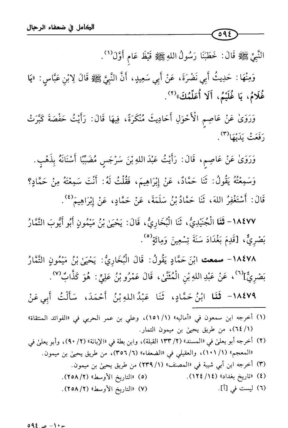 18478 - سمعت ابن حماد يقول: قال البُخاري: يحيى بن ميمون التمار، بصري، عن عَبد الله بن المثني، قال عَمرو بن علي: هو كذاب.
