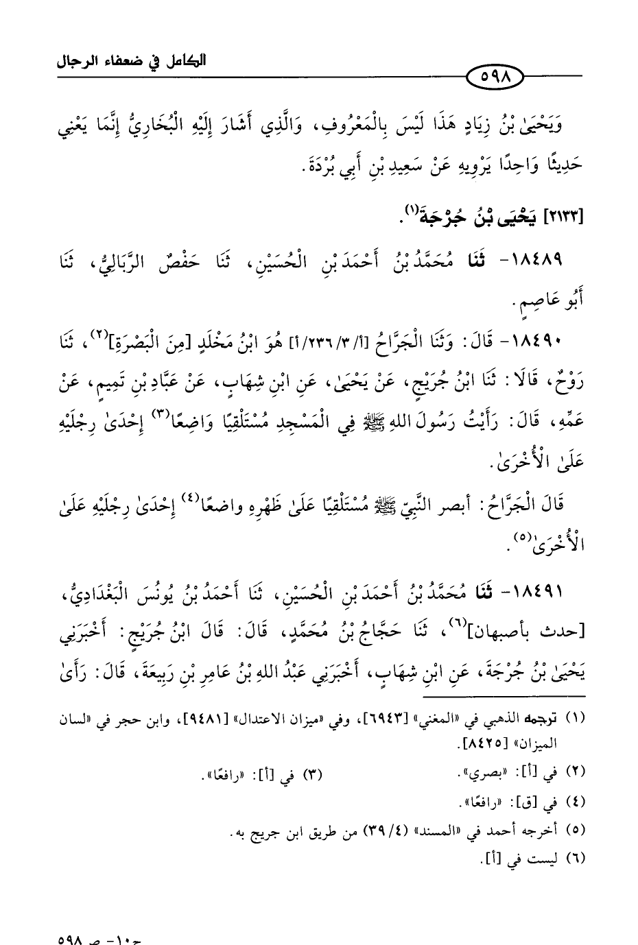 18490 - وحَدَّثنا الجراح هو ابن مخلد من البصرة، حَدثنا روح، قالا: حَدثنا ابن جُرَيج، عن يحيى، عن ابن شهاب، عن عباد بن تميم، عن عَمِّه، قال: رأيتُ رسول الله صَلى الله عَليه وسَلم في المسجد مستلقيا، واضعا إحدى رجليه على الأخرى،- قال الجراح-: أبصر النبي صَلى الله عَليه وسلم مستلقيا على ظهره رافعا إحدى رجليه على الأخرى.