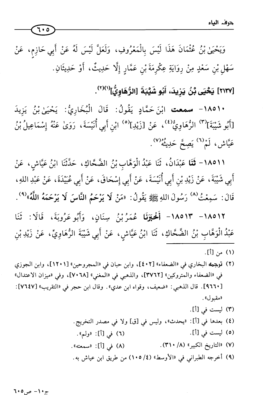 18510 - سمعتُ ابن حماد، يقول: قال البُخاري: يحيى بن يزيد أَبو شيبة الرهاوي، عن زيد عن ابن أبي أُنَيسة، روى عنه إسماعيل بن عياش، لم يصح حديثه.