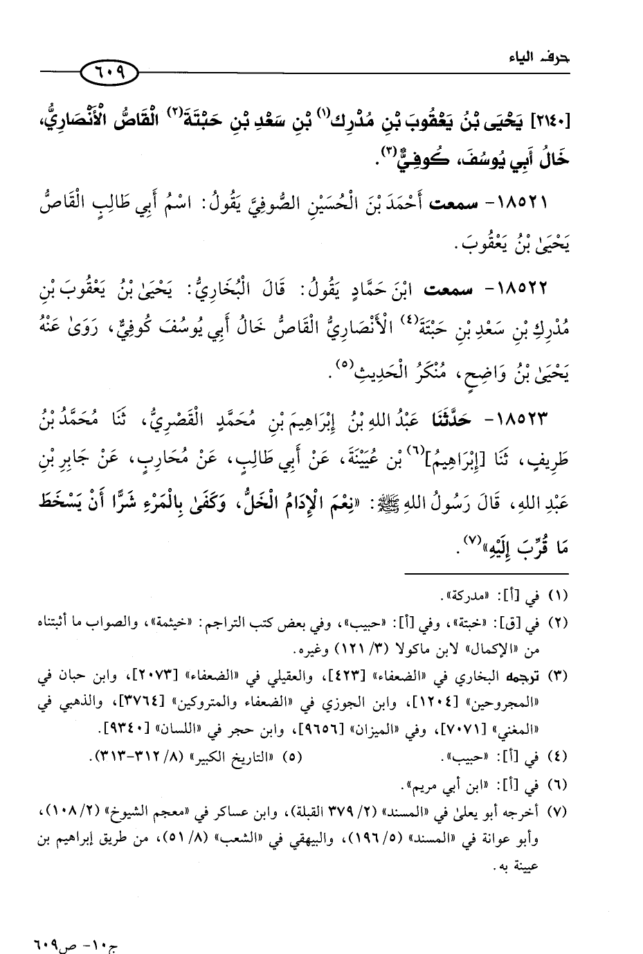 18522 - سمعتُ ابن حماد، يقول: قال البُخاري: يحيى بن يعقوب بن مدرك بن سعد بن حبتة الأنصاري القاص، خال أبي يوسف كوفي، روى عنه يحيى بن واضح، منكر الحديث.