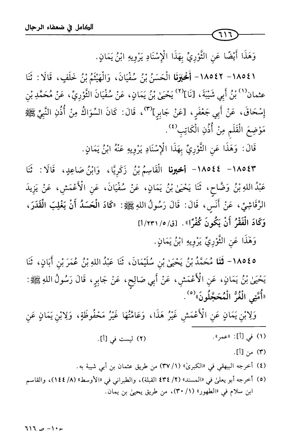 18545 - حَدثنا مُحمد بن يحيى بن سليمان، حَدثنا عَبد الله بن عُمر بن أَبَان، حَدثنا يحيى بن يمان، عن الأَعمَش، عن أبي صالح، عن جابر، قال رسول الله صَلى الله عَليه وسلم: أُمَّتي الغر المحجلون.