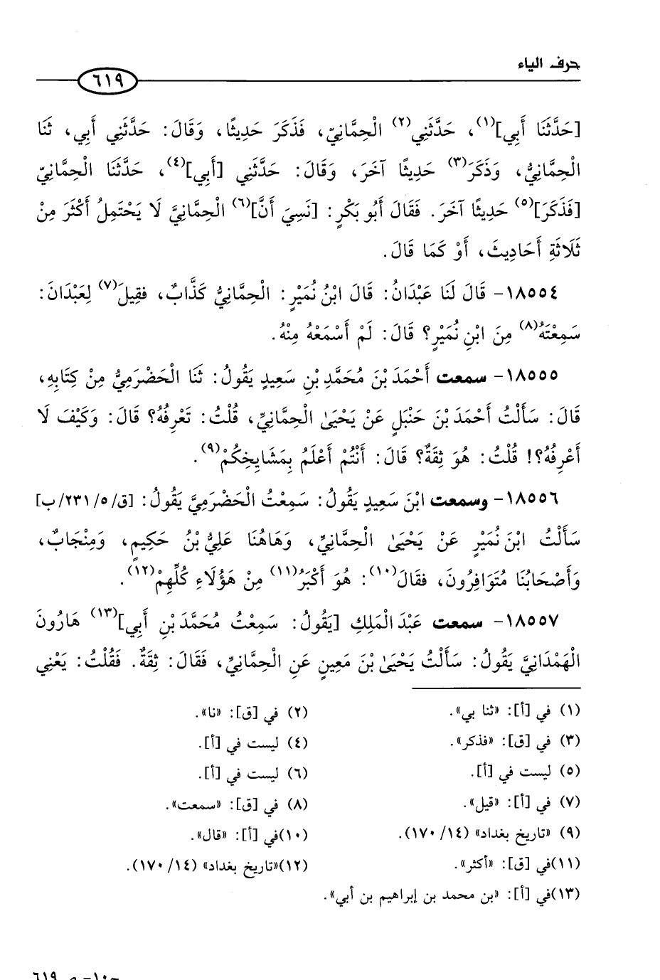18554 - قال لنا ابن عبدان: قال ابن نُمَير: الحماني كذاب، فقيل لعبدان: سمعته من ابن نُمَير؟ قال: لم أسمعه منه.