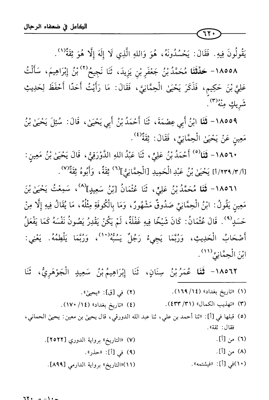 18560 - حَدثنا أحمد بن علي، حَدثنا عَبد الله الدورقي، قال يحيى بن مَعين: يحيى بن عَبد الحميد الحماني ثقة، وأبوه ثقة.