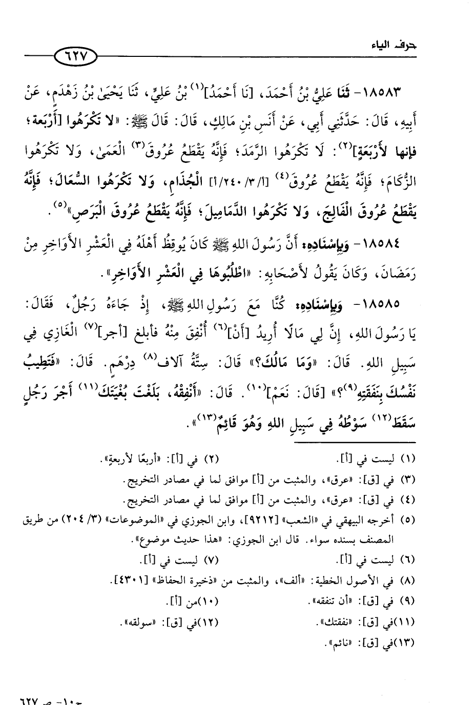 18583 - حَدثنا علي بن أحمد، حدثنا أحمد بن علي، حَدثنا يحيى بن زهدم، عن أبيه، قال: حَدَّثني أبي، عن أَنَس بن مالك، قال: قال صَلى الله عَليه وسلم: لا تكرهوا أَرْبعًا فإنها لأربعة: لا تكرهوا الرمد فإنه يقطع عروق العمي، ولا تكرهوا الزكام فإنه يقطع عروق الجذام، ولا تكرهوا السعال فإنه يقطع عروق الفالج، ولا تكرهوا الدماميل فإنه يقطع عروق البرص.