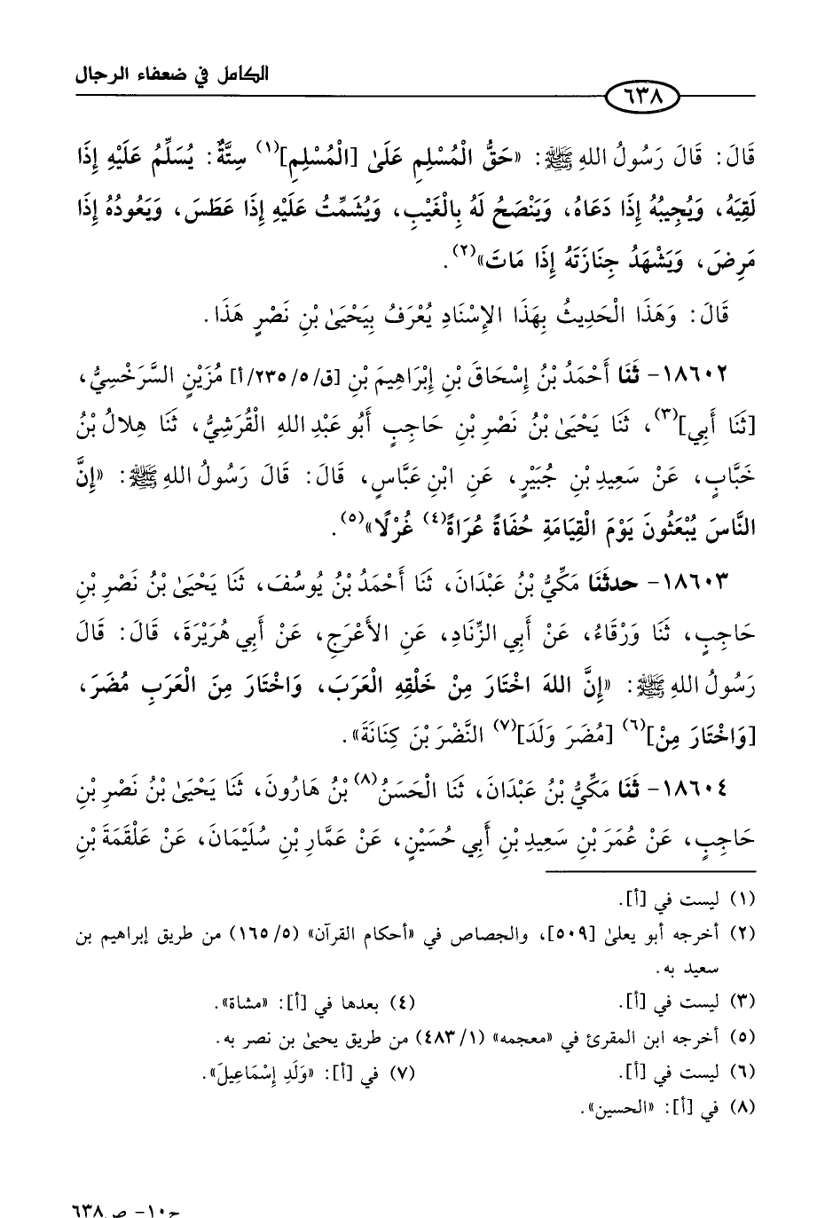 18602 - حَدثنا أحمد بن إسحاق بن إبراهيم بن مزين السرخسي، حَدثنا أبي، حدثنا يحيى بن نصر بن حاجب أَبو عَبد الله القرشي، حَدثنا هلال بن خباب، عن سعيد بن جُبَير، عن ابن عباس، قال: قال رسول الله صَلى الله عَليه وسَلم: إِنّ الناس يبعثون يوم القيامة حفاة عراة غرلا.