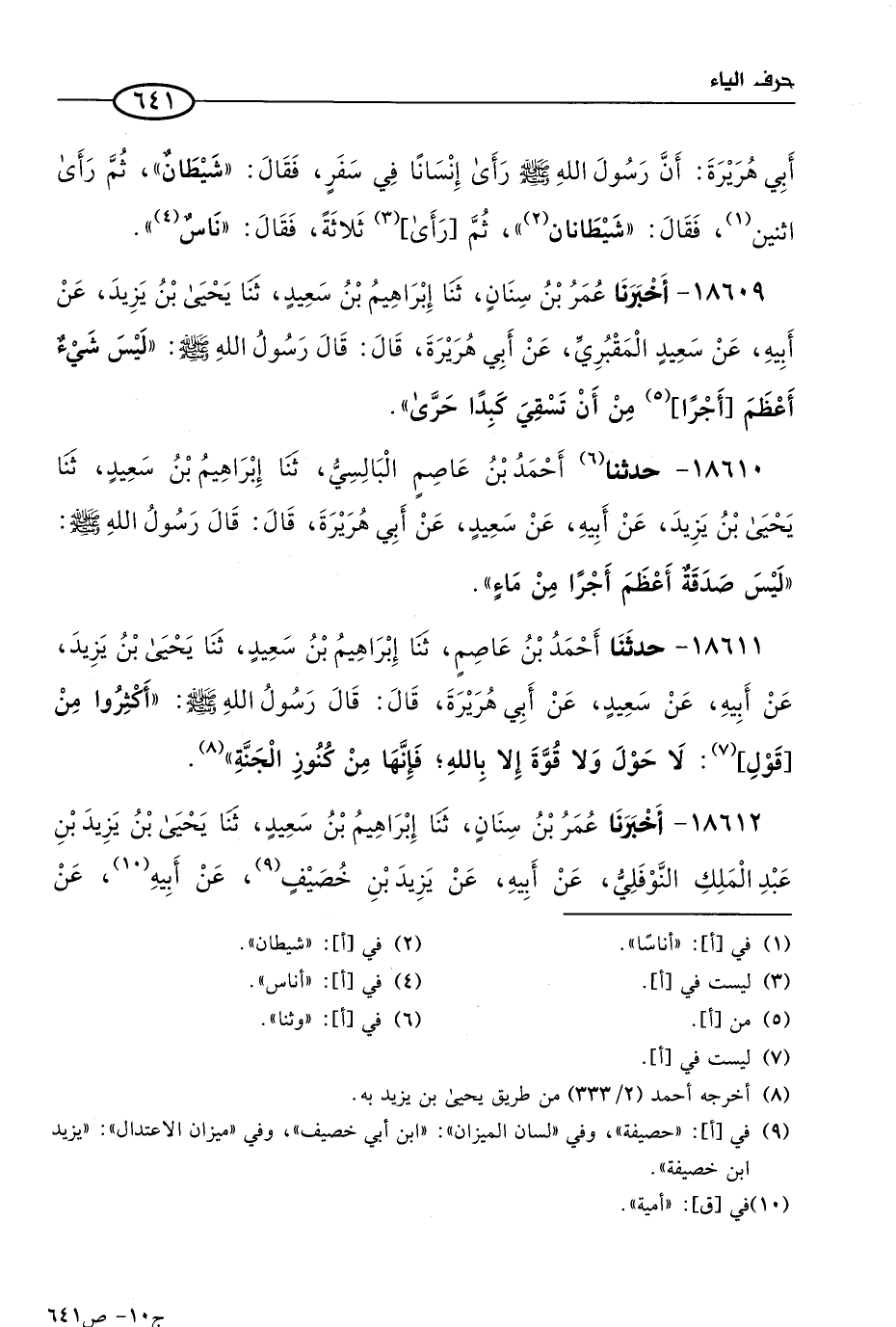 18609 - أخبرنا عمر بن سنان، حَدثنا إبراهيم بن سعيد، حَدثنا يحيى بن يزيد، عن أبيه، عن سعيد المقبري، عن أبي هريرة، قال: قال رسول الله صَلى الله عَليه وسَلم: ليس شيء أعظم أجرا من أن تسقي كبدا حرَّى.