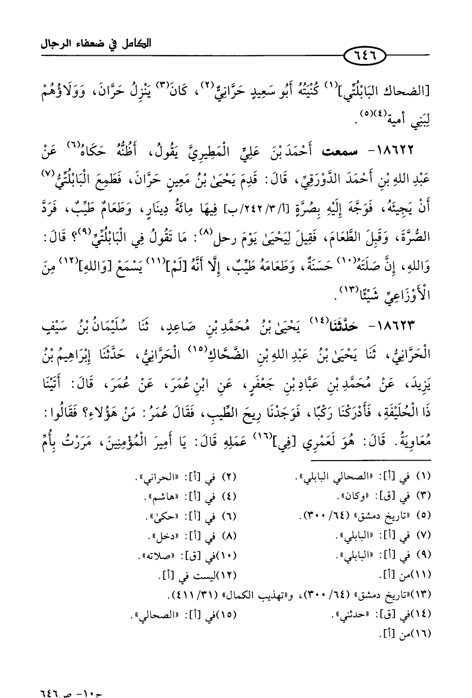 18622 - سمعت أحمد بن علي المطيري، يقول: أظنه حكاه عن عَبد الله بن أحمد الدورقي، قال: قدم يحيى بن مَعين حران، فطمع البَابْلُتّي أن يجيئه فوجه إليه بِصُرَّة فيها مِئَة دينار وطعام طيب، فرد الصرة وقبل الطعام، فقيل ليحيى يوم رحل: ما تقول في البَابْلُتّي؟ قال: والله إن صلته حسنة وطعامه طيب، إلا أنه لم يسمع والله من الأَوزاعي شَيئًا.