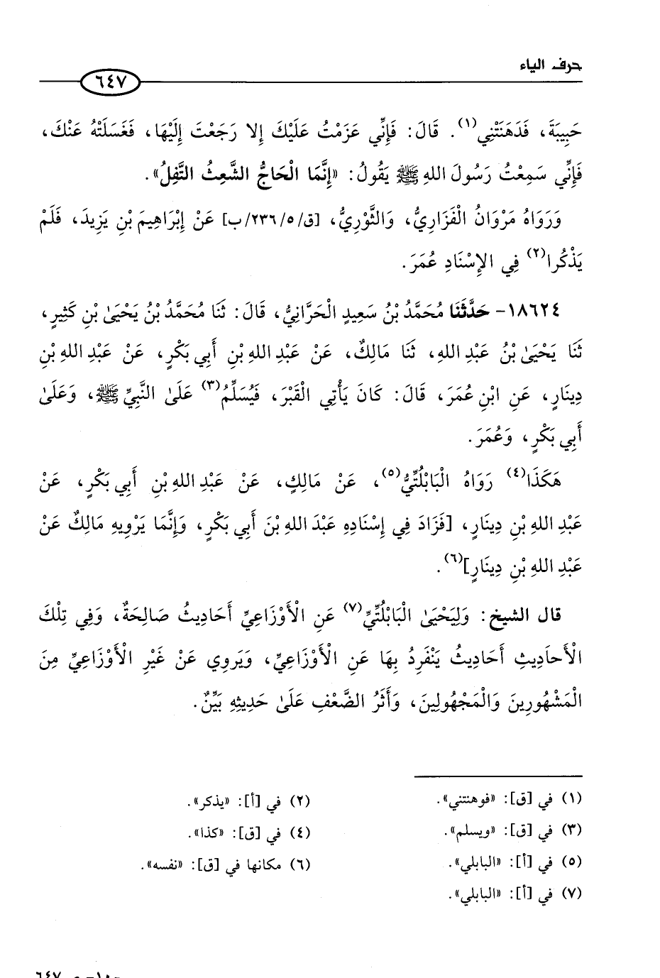 18624 - حَدثنا مُحمد بن سعيد الحراني، قال: حَدثنا مُحمد بن يحيى بن كثير، حَدثنا يحيى بن عَبد الله، حَدثنا مالك، عن عَبد الله بن أبي بكر، عن عَبد الله بن دينار، عن ابن عُمر، قال: كان يأتي القبر فيسلم على النبي صَلى الله عَليه وسلم وعلى أبى بكر وعمر.