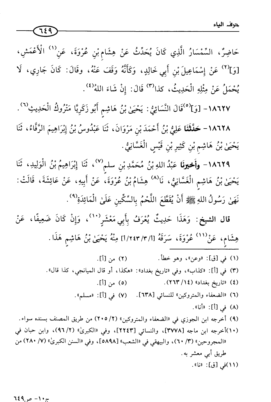 18629 - وأخبرنا عَبد الله بن مُحمد بن سلم، حَدثنا إبراهيم بن الوليد، حَدثنا يحيى بن هاشم الغساني، حدثنا هشام بن عروة، عن أبيه، عن عائشة قالت: نهى رسول الله صَلى الله عَليه وسَلم أن يقطع اللحم بالسكين على المائدة.