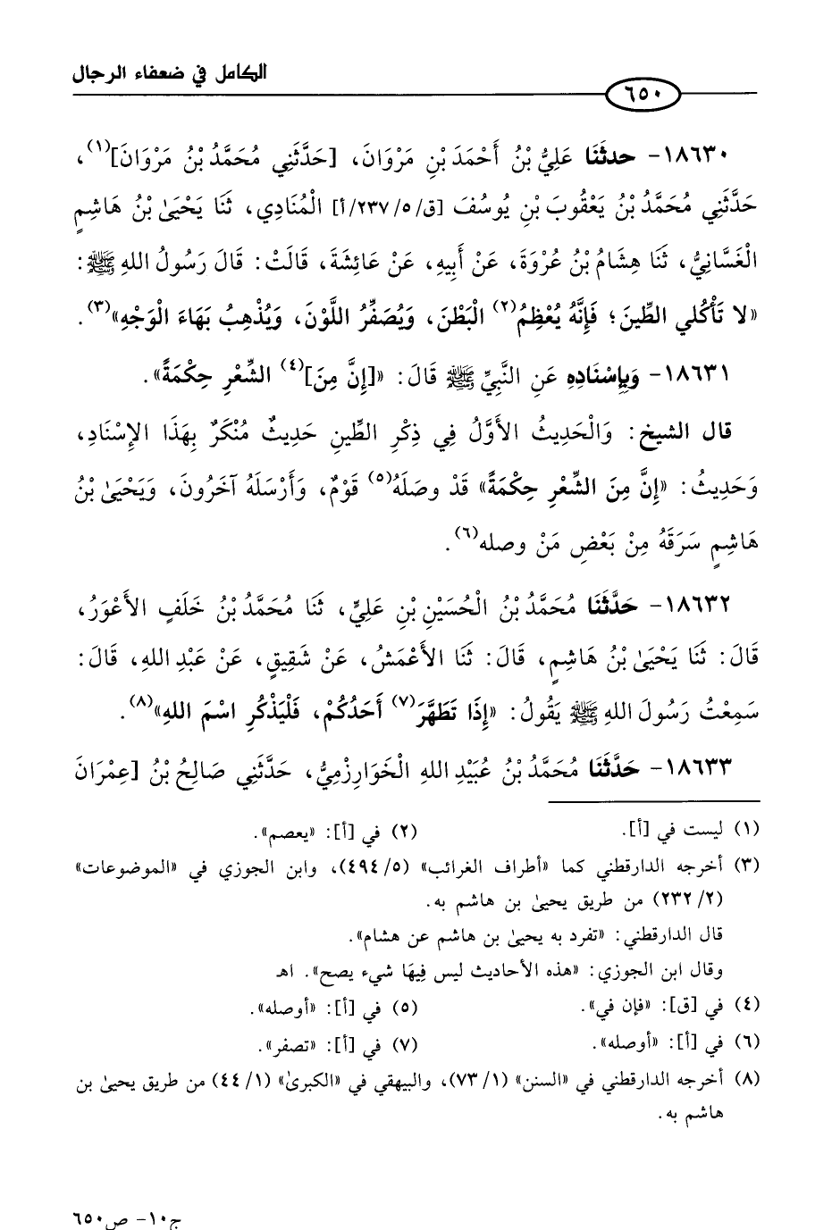 قال الشيخ: والحديث الأول في ذكر الطين حديث منكر بهذا الإسناد، وحديث، إن من الشعر حكمة، قد وصله قوم وأرسله آخرون، ويحيى بن هاشم سرقه من بعض من وصله.
