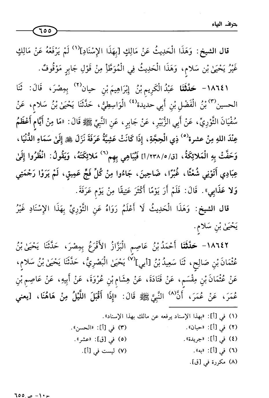 18641 - حَدثنا عَبد الكريم بن إبراهيم بن حيان بمصر، قال: حَدثنا الحسين بن الفضل بن أبي حديدة الواسطي، حَدثنا يحيى بن سلام، عن سفيان الثَّوري، عن أبي الزبير، عن جابر، عن النبي صَلى الله عَليه وسَلم قال: ما من أيام أعظم عند الله من عشرة ذي الحجة، إذا كانت عشية عرفة، نزل عَزّ وجَلّ إلى سماء الدنيا وحفت به الملائكة فيباهي به ملائكته، ويقول: انظروا إلى عبادي أتوني شعثا غبرا ضاحين، جاءوا من كل فج عميق، لم يروا رحمتي، ولا عذابي. قال: فلم أر يومًا أكثر عتيقا من يوم عرفة.